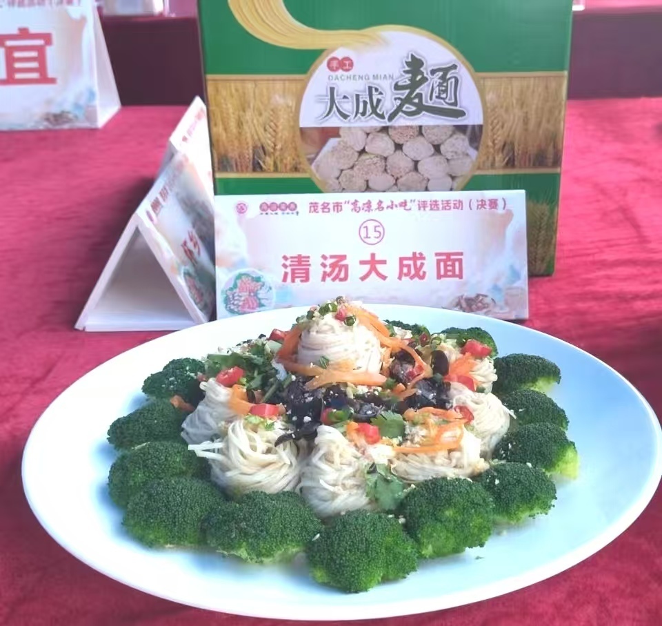 信宜市大成镇群众种植小麦历史悠久,大成面以传统工艺制作而成。大成面,寓意“长寿”面,也“大有面子”之意。 大成面是家居膳食或送礼的佳品,更是许多海内外游子记忆里的家乡味道。如今,大成面已发展成为广东特别是粤西美食文化的标志性产品,成为国内外游客到信宜必买的手信之一,产品畅销全国各地,每千克的价格比外地同类面条的价格贵4元。