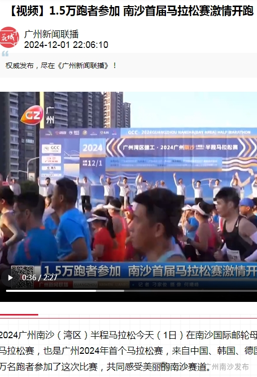 《赛道路线图官宣!速览南沙半程马拉松精彩看点》《近4万人参赛,南沙这场青春马拉松太燃了!》《视频|速览2024广州南沙(湾区)半程马拉松路线图》广泛分发全网平台,收获10万+流量。