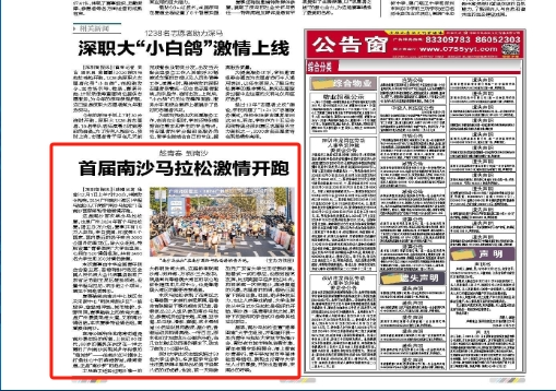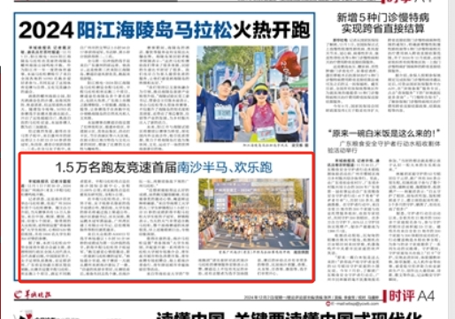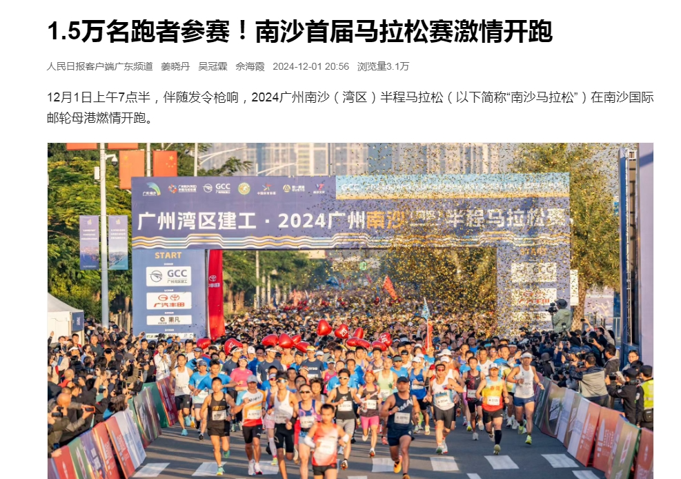 在《南方日报》广州版发布活动全景式报道,同日全国近20场开跑下,“南马”以青春活力特色突围,获得广大年轻人的喜爱,并在年轻人中出圈,介绍除了马拉松,南沙常态化举办音乐节、体育赛事等特色活动,持续生成城市烟火气,丰富吃喝玩乐一应俱全的15分钟生活圈,最大程度展现南沙如何对青年更友好,让青年更有为。