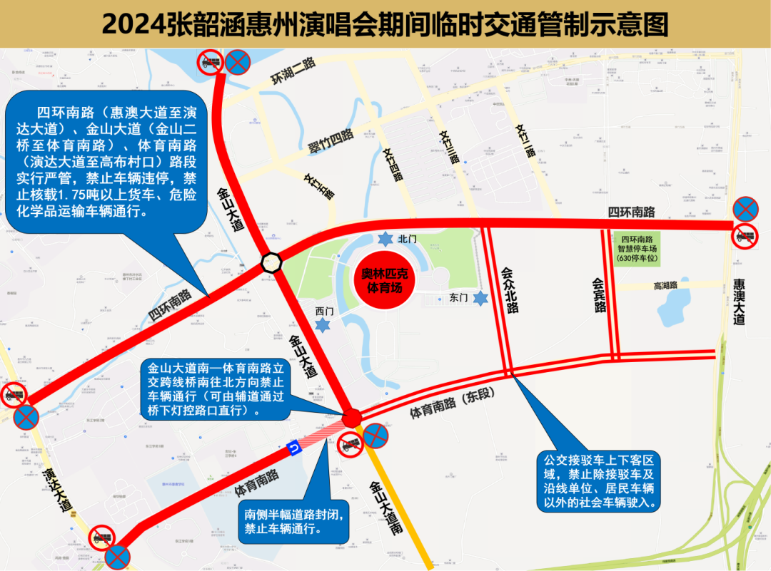 交通管制期间,四环南路(惠澳大道至演达大道)、金山大道(金山二桥至体育南路)、体育南路(演达大道至高布村口)路段实行严管,禁止车辆违停,禁止核载1.75吨以上货车、危险化学品运输车辆通行。