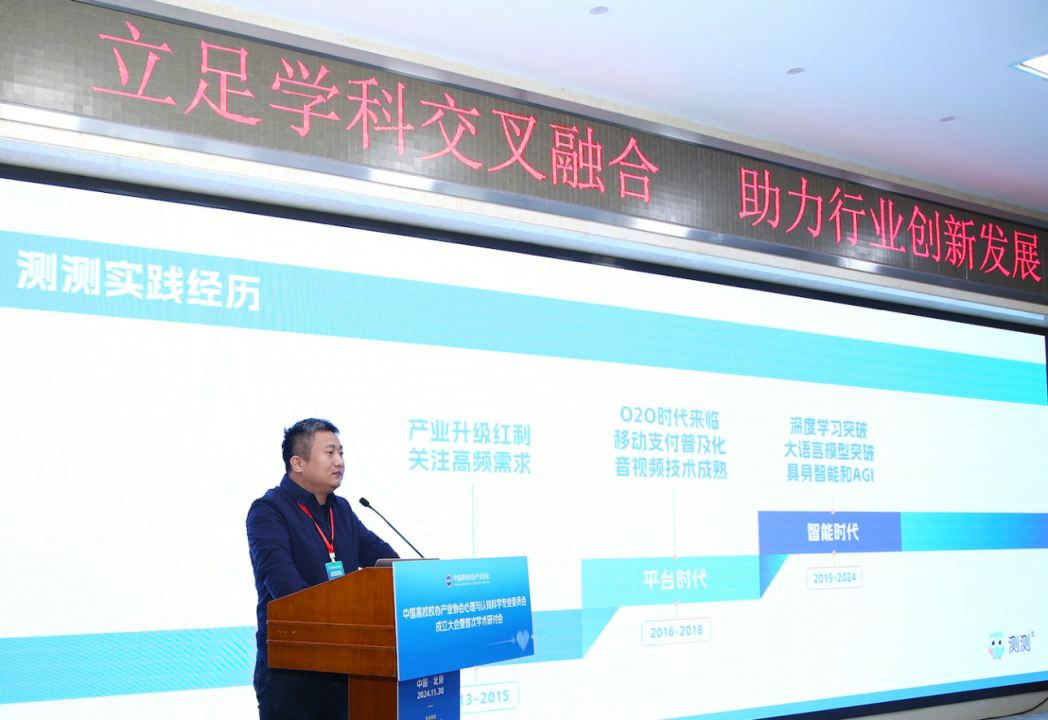 任永亮首先介绍了泛心理行业的现状和发展背景,指出了当下大众对于心理健康需求的日益扩张背后的现实因素,之后分享了心言集团旗下产品测测App自2013年成立以来在移动时代、平台时代和智能时代三个不同阶段的实践经历——在移动时代,测测App抓住了大众创业、万众创新的需求端升级红利,满足了用户的高频需求,也为测测带来了飞速的发展机会;平台时代,随着O2O的到来和移动支付的普及,测测App进一步拓展了服务范围,在变化中寻找不变的坚持;智能时代,随着深度学习和大语言模型的突破,心言集团在将大模型与垂直行业进行整合方面取得了显著进展,并将基于自身对于用户和技术的理解,探索更多AI技术的前沿。