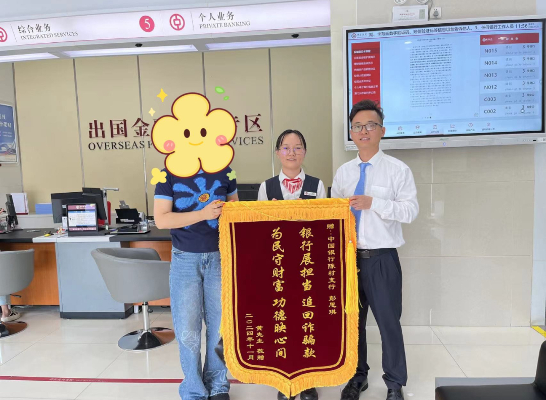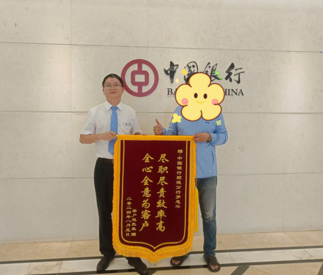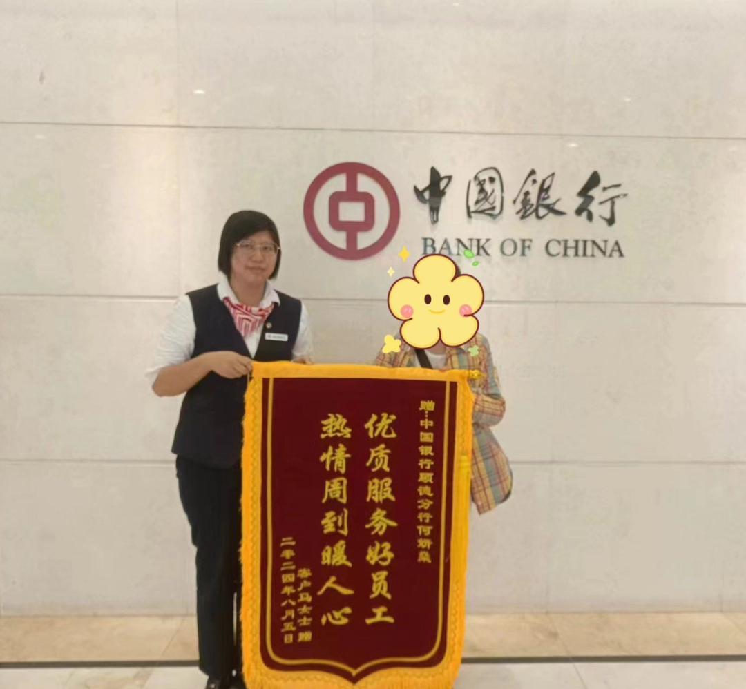 顺德中行工作人员以用心专业的服务、锲而不舍的职业态度,竭力为客户“千里追款”,用“中行速度”避免了客户的资金损失,深深打动了客户,远在英国的黄先生特意委托其家人向顺德中行两家支行送上锦旗表达谢意。
