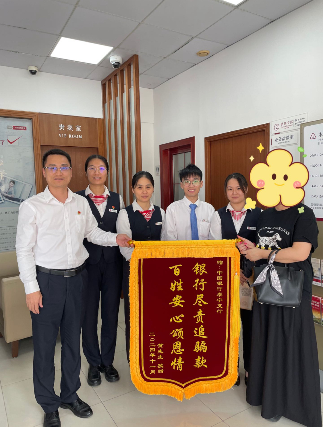 “感谢你们热情高效的服务,真的是帮了我们大忙!”客户马女士和赵先生再次来到顺德中行营业部罗思华和何妍燊跟前。还没等两人反应过来,客户马女士和赵先生就掏出两块“金边红布”,径直塞到两人手中。