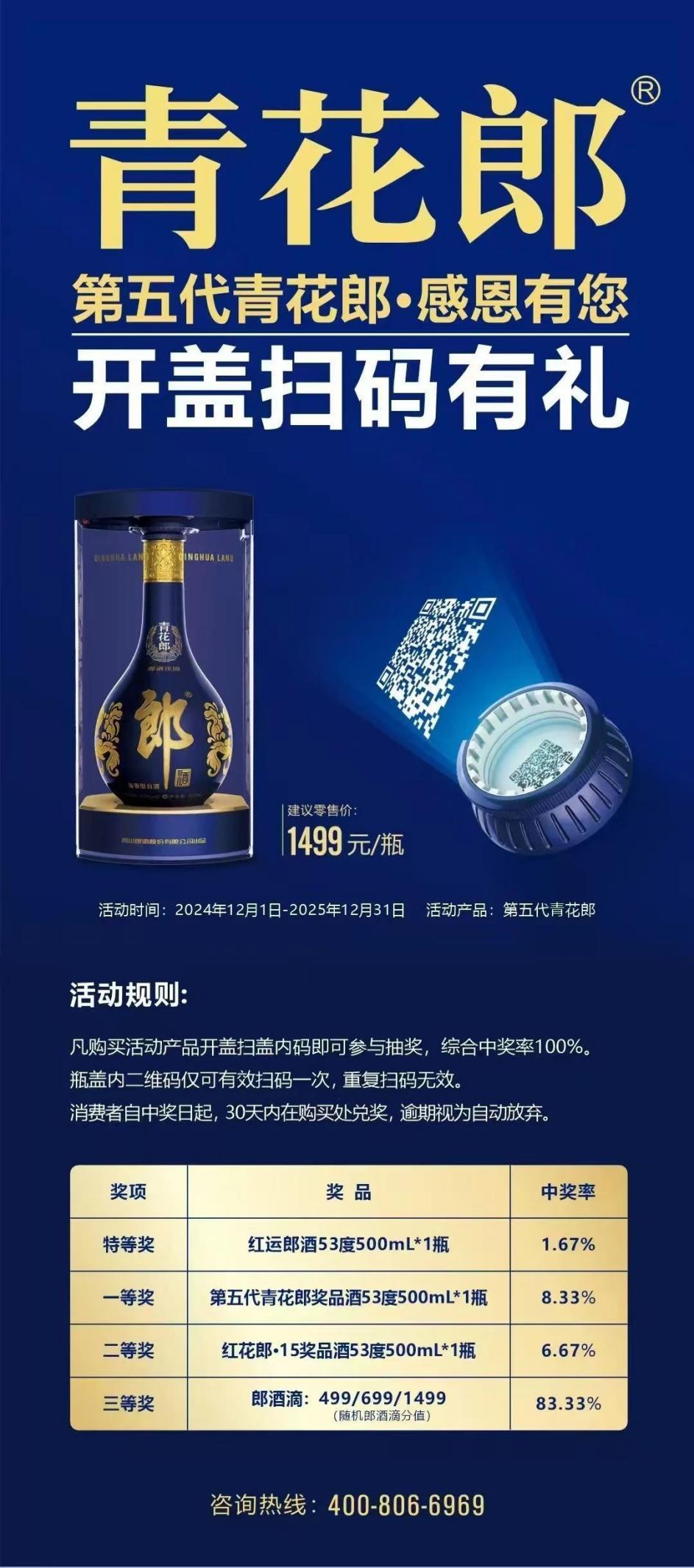 据悉,第五代青花郎开盖扫码有礼活动将持续至2025年12月31日。活动期间,消费者购买第五代青花郎,开启瓶盖扫码后即可参与抽奖,中奖率高达100%,最高奖项特等奖为红运郎1瓶(500mL装、酒精度53vol%),还有一等奖第五代青花郎奖品酒53度500mL*1瓶、二等奖红花郎·15奖品酒53度500mL*1瓶、三等奖郎酒滴499/699/1499等奖品。其中,郎酒滴可在微信小程序“郎酒 PLUS”兑换精美礼品。