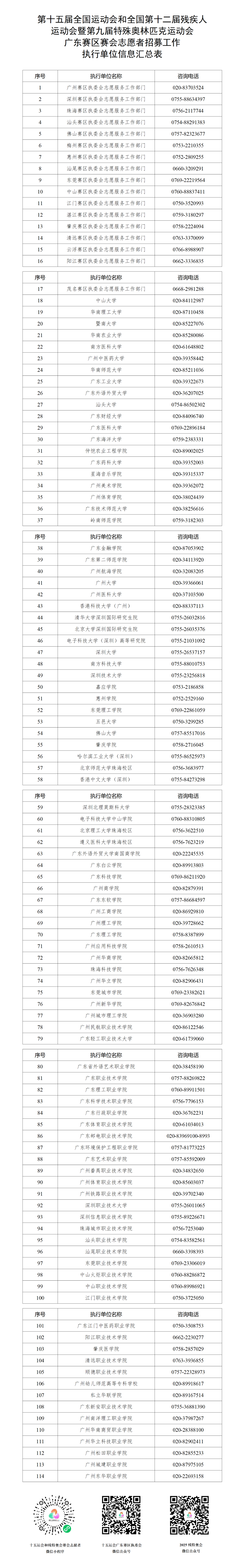 附件:第十五届全国运动会和全国第十二届残疾人运动会暨第九届特殊奥林匹克运动会广东赛区赛会志愿者招募工作执行单位信息汇总表(详见下方)