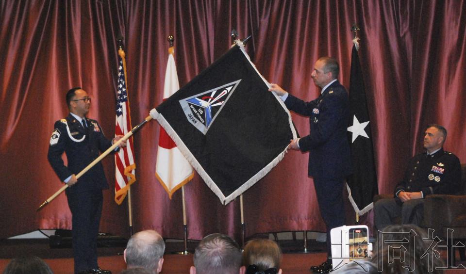 12月4日,驻日美军在横田基地(东京)展示“美国驻日太空军”旗帜(图源:共同社)