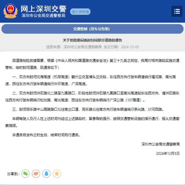 12月5日,深圳市公安局交通警察局发布通告称,因道路抢险救援需要,根据《中华人民共和国道路交通安全法》第三十九条之规定,对相关路段实施交通管制,临时封闭道路,结束时间另行通告。