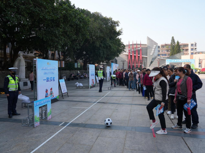 活动现场热闹非凡,居民群众排队参加体验活动。记者了解到,现场设置了普法咨询区、游戏专区(“欢乐投壶”“趣味套圈”“一蹴成名”)、货车盲区体验等,通过宣传展板、沉浸式体验、特色拍照打卡等多形式普及交通安全知识,全方位提升居民群众交通出行规则意识、法治意识和文明意识,吸引大家前往各活动区域“打卡”。