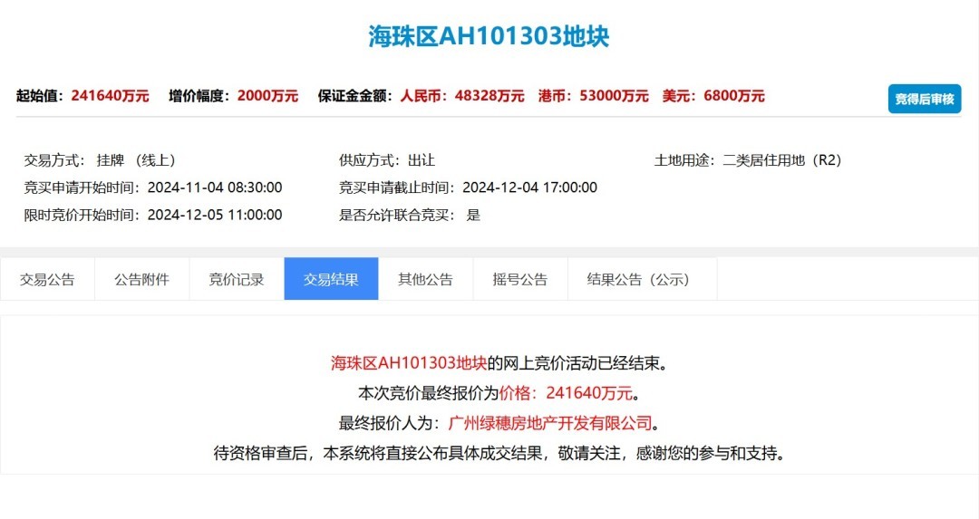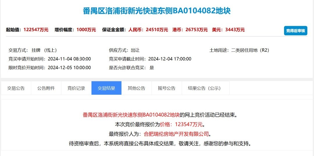 12月土地市场持续保持着热度,全月计划有23宗涉宅地块出让,起拍总金额超过250亿元。继前两日成交了四宗地块后,12月5日,番禺、海珠两宗宅地为市场添了一把火。其中,番禺洛浦街新光快速东侧地块经过一轮竞价,以123547万元0.8%的溢价被合肥瑞伦房地产开发有限公司拿下。海珠区AH101303地块(原海珠客运站地块)以底价241640万元被广州绿穗房地产开发有限公司拿下。