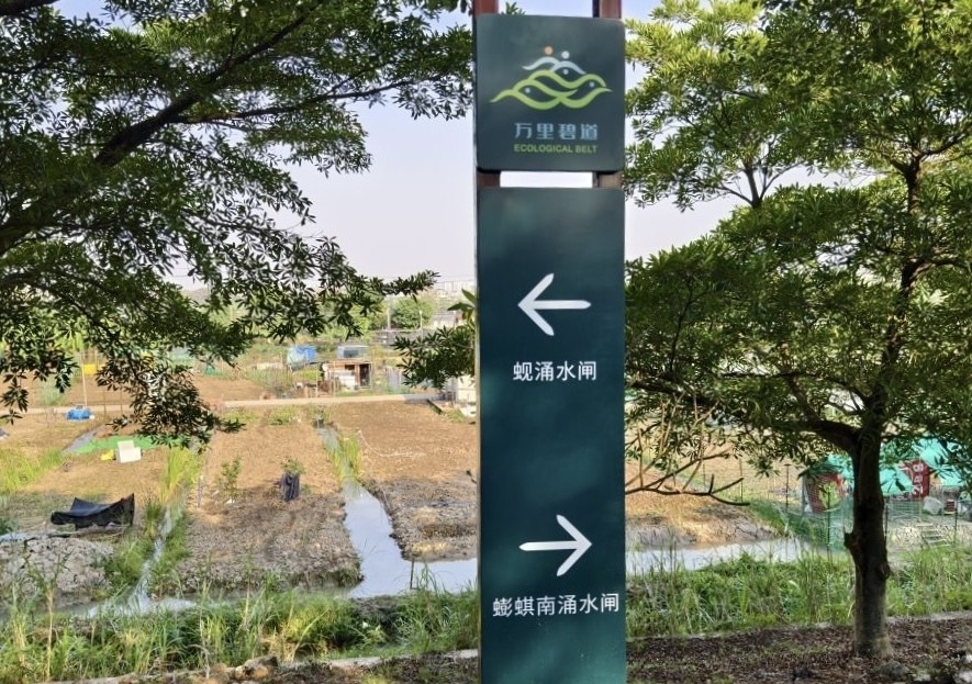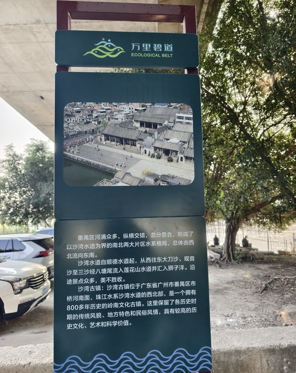 记者沿着碧道一路前行,从草河村大九律大桥桥底到沙湾大桥桥底,再穿过沙湾大桥桥底到蚬涌水闸。一路上,河道的风光、田园的美景、工业区的风貌尽收眼底。每隔一段距离,都能看到碧道的总平面图、导览图以及沙湾水道河长的公示栏,这些设施不仅方便了游客游览,也体现了相关部门对这条碧道的用心设计。此外,碧道沿途还设置了多个景点介绍牌,让游客在欣赏美景的同时,也能了解到更多关于沙湾水道的历史和文化。