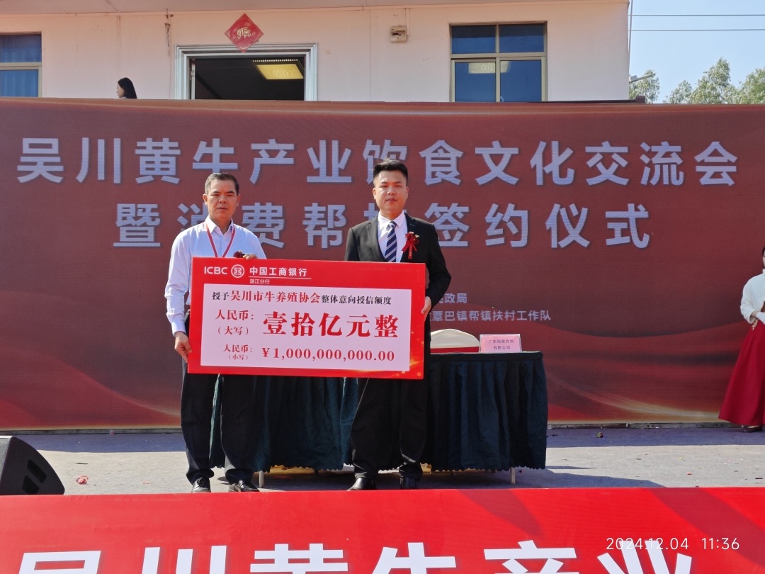 会上,中国工商银行湛江分行陈学强副行长代表该行与吴川市牛养殖协会签订了金融支持吴川黄牛产业高质量发展战略合作意向书,授予吴川市牛养殖协会整体意向授信额度达10亿元人民币,以实际行动助力乡村振兴战略的实施,为吴川黄牛产业高质量发展当好“金融后盾”。