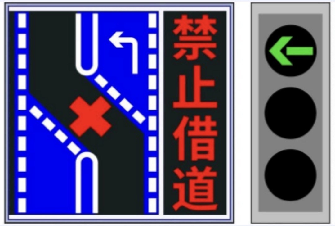 当显示屏显示红灯“禁止借道”,左转箭头灯绿灯时,左转车辆禁止驶入借道区域,已在借道区域车辆根据左转绿灯驶离路口。