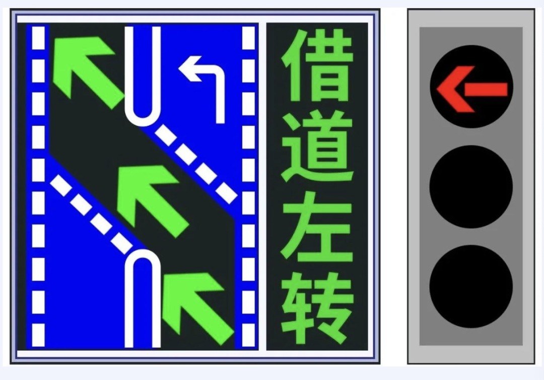 当显示屏显示绿灯“借道左转”,左转箭头灯红灯时,左转车辆可驶入借道区域等待左转信号灯转为绿灯通行。