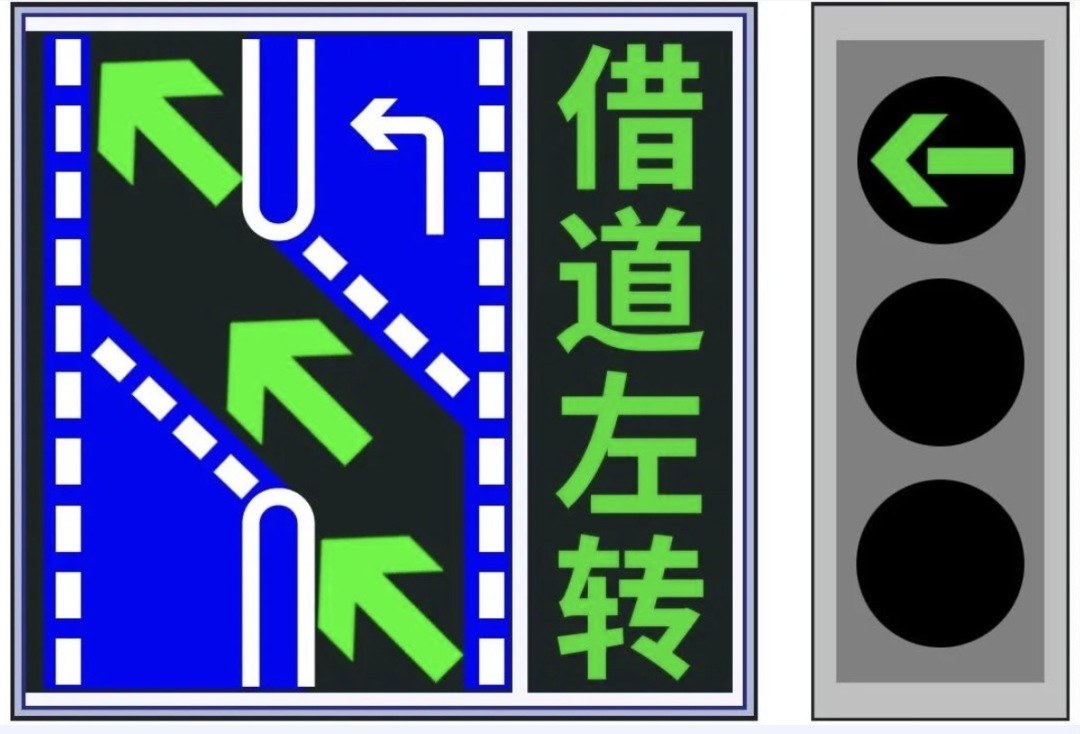 当显示屏显示绿灯“借道左转”,左转箭头灯绿灯时,左转车辆可继续使用借道区域通过路口。