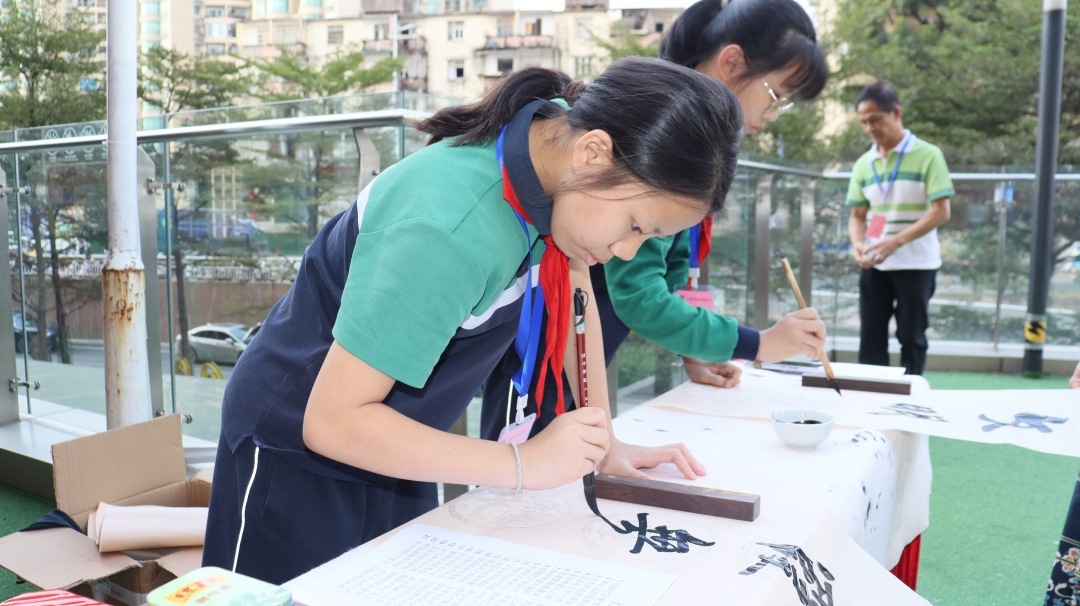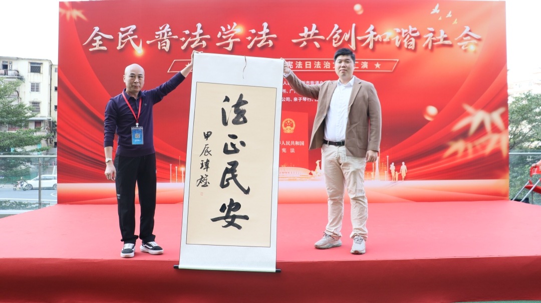 在书法赠送环节,广东省书法家协会会员谭玮雄向新市街汇侨南社区党总支书记刘穗华赠送“法正民安”的书法作品,寓意人民遵守法律法规,社会稳定和谐,祖国繁荣昌盛。