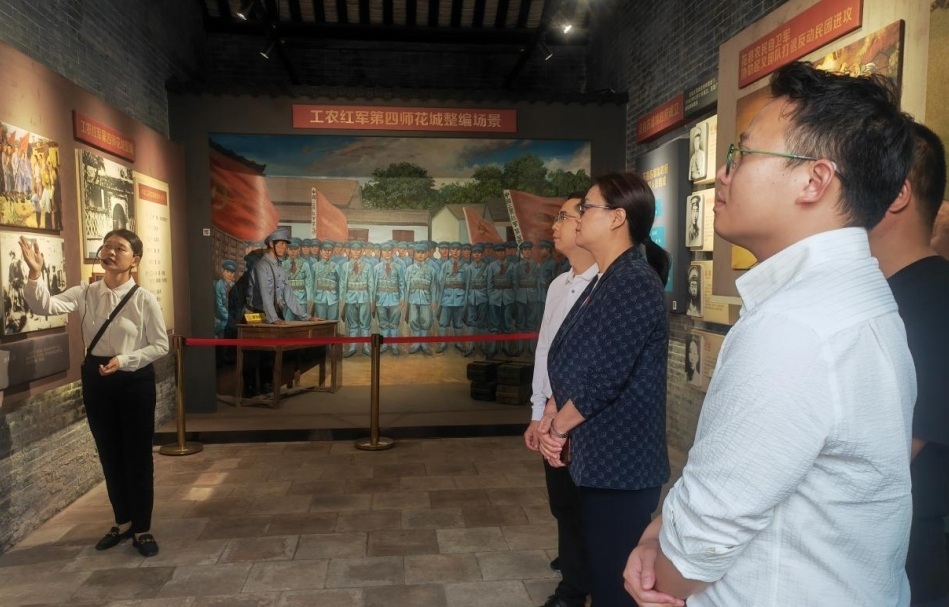 调研组一行先到花东镇九湖村王氏大宗祠,通过参观一件件珍贵的展品、一幅幅生动的历史画面,深切感受到了革命先辈们付出的巨大牺牲和不懈努力。在参观过程中,两地领导还就红色文化的保护与利用进行了深入交流。花东镇党委副书记李国东详细介绍了花东镇在红色文化挖掘、传承和弘扬方面的经验和做法。他表示,花东镇将继续加大对红色文化的保护和宣传力度,用红色文化资源赋能乡村振兴。赵秀萍副县长对此给予了高度评价,并希望两地能够进一步加强红色文化交流与合作,共同打造红色文化旅游品牌,为乡村振兴注入新的文化内涵和动力。