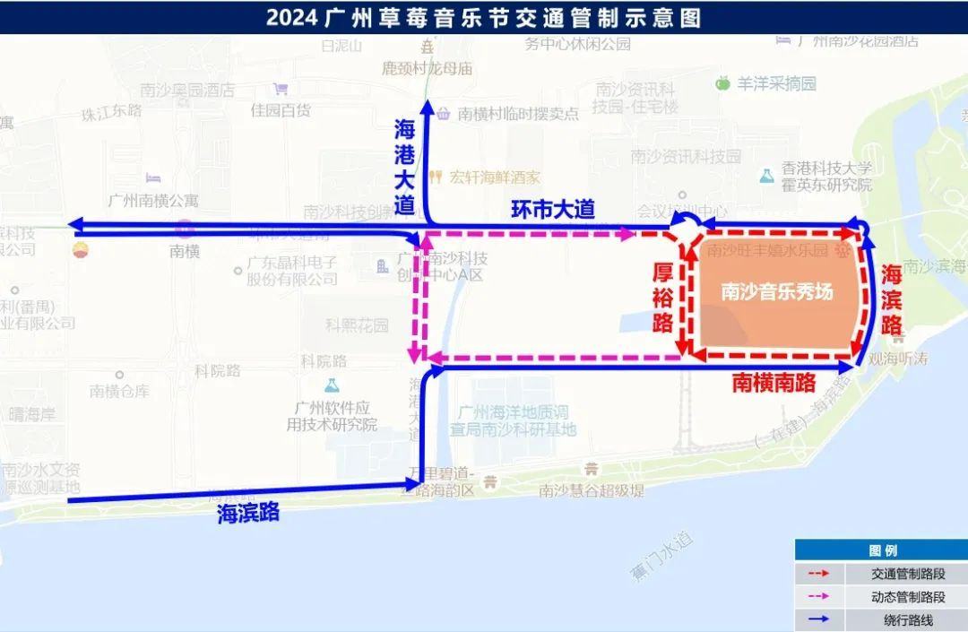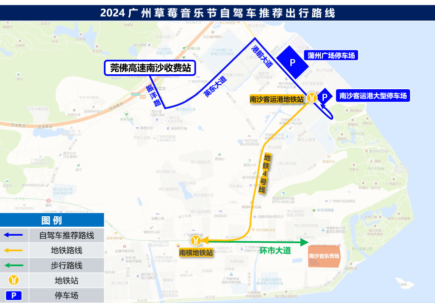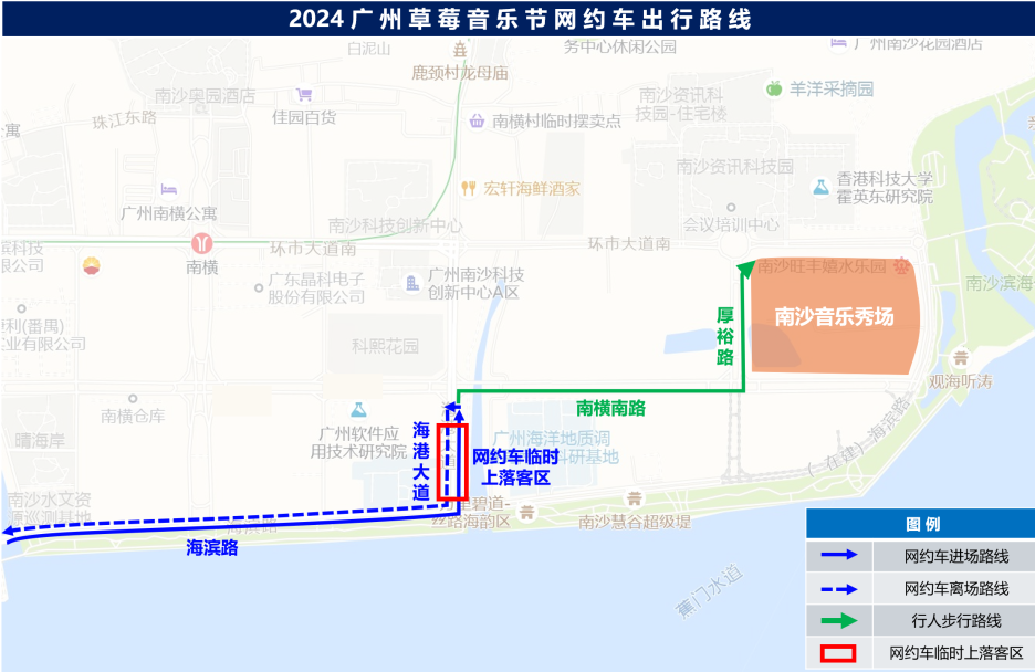 乘坐网约车出行的观众,可在海港大道(海滨路-南横南路)下车后步行前往南沙音乐秀场。