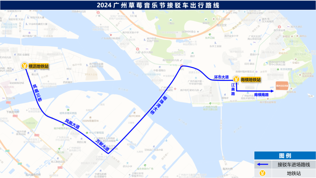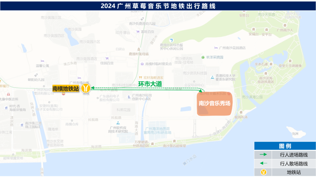 在横沥地铁站及南横地铁站出站的观众,可乘坐主办方安排的接驳车到达南沙音乐秀场。
