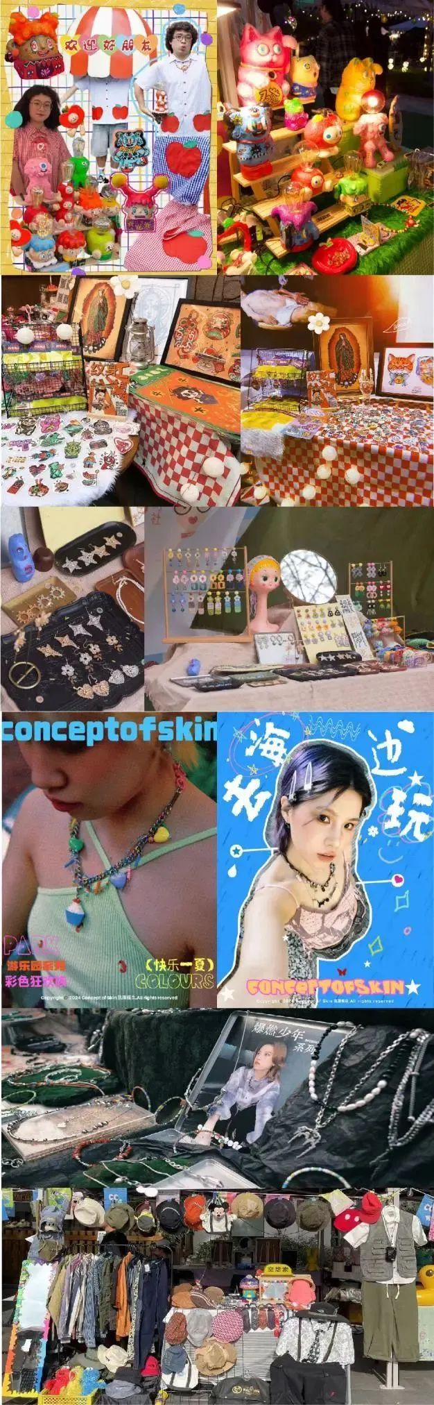 在这里,你可以探索:花里胡哨的原创插画、原创服饰,来自印度、尼泊尔的“不完美”手工制造,布料与其他材料创作出的帽子、发带、包包,不同材质打造线条与具象结合的饰品,自带氛围感的火漆文创饰品,来自澳门的青年文创潮牌,坚信“玩耍可以成就事业”的创意文化产品,有趣的古着,还有现场脏辫编发,复古又大胆完美适配音乐节的气质!