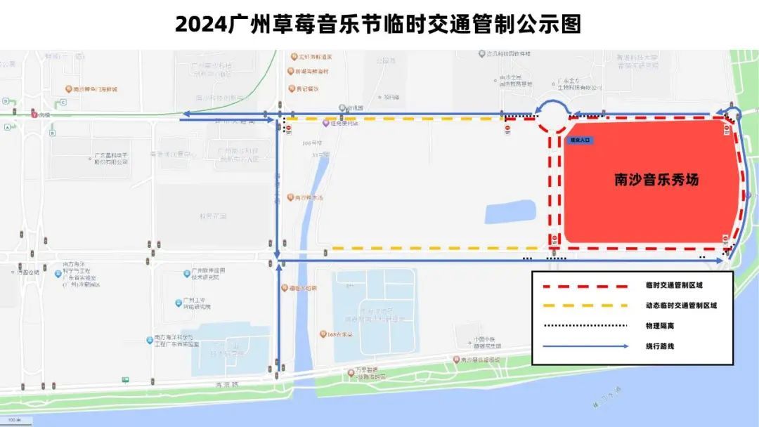 在“广州南沙发布”公众号后台发送“草莓音乐节交通管制”关键词,查看高清临时交通管制公示图。