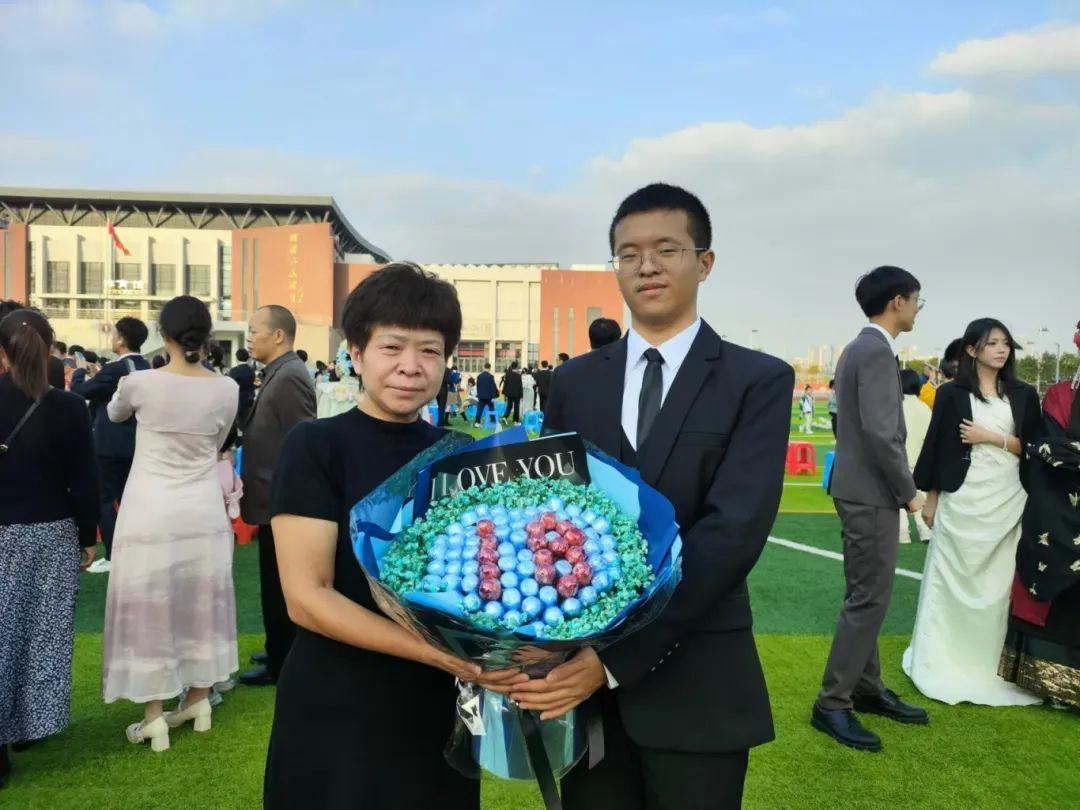当天,高三年级的陶志伟同学收到了来自妈妈亲手制作零食花束。陶志伟的妈妈杨女士分享说,这是她第一次尝试DIY花束,花束中央是由陶志伟最爱吃的巧克力组成的数字“18”,花束的边缘则以蓝色的满天星作搭配。