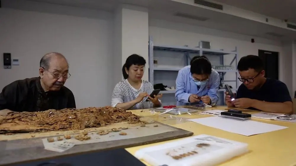 图为甲胄修复专家白荣金(左一)在观察海昏侯墓甲片堆积物。江西省文物考古研究院供图
