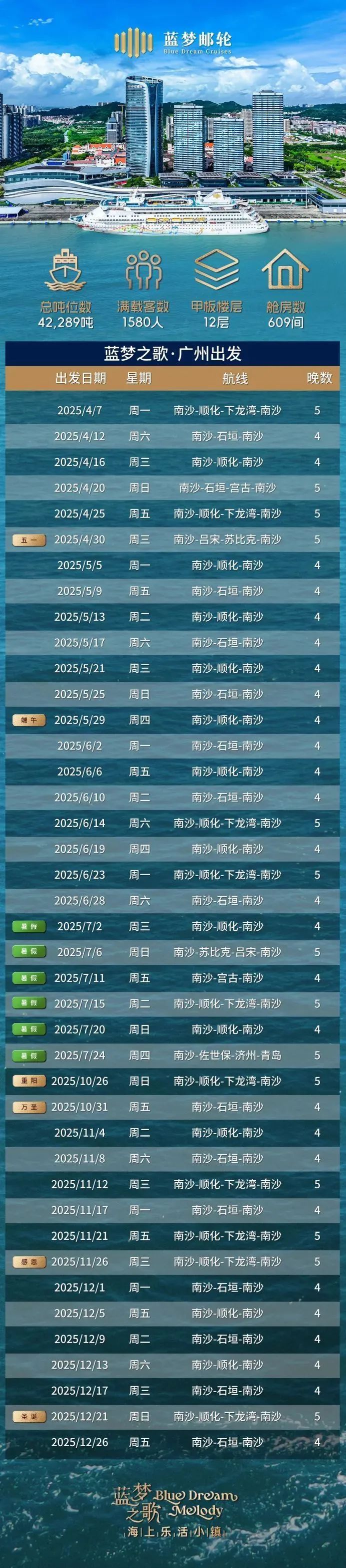 12月6日,上海蓝梦国际邮轮股份有限公司发布了“蓝梦之歌” 号2025年广州航线计划,全年计划运营41航次,航期将覆盖4月至7月及10月至12月。