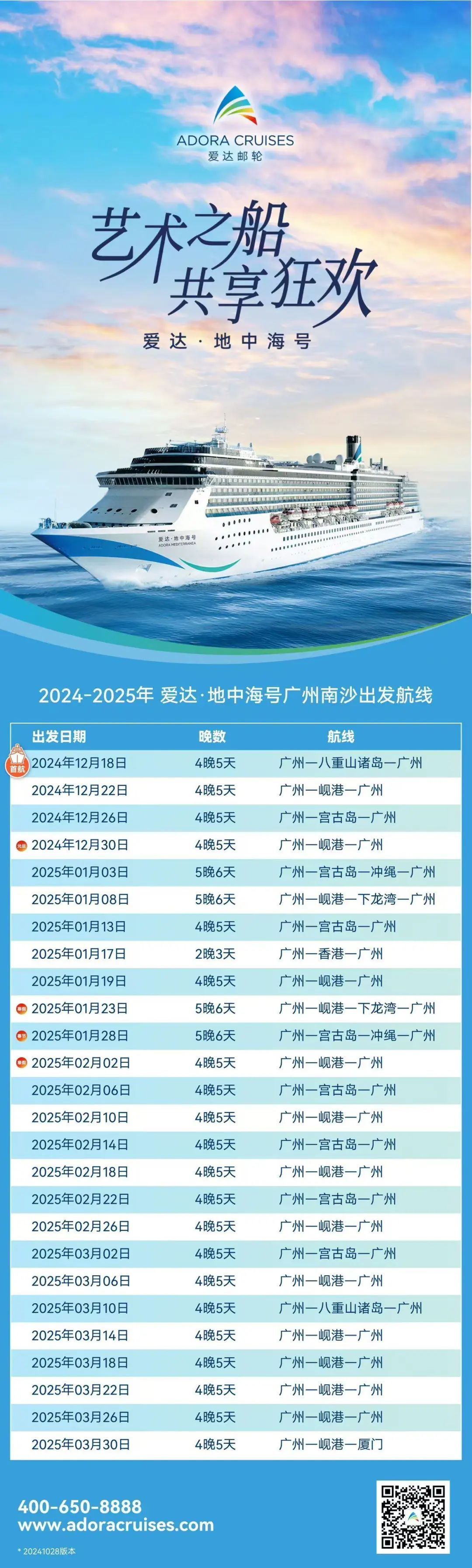 爱达邮轮(Adora Cruises)宣布旗下爱达·地中海号将于2024年12月18日开启从广州南沙出发的2晚3天至5晚6天的国际邮轮航线。航线覆盖中国香港、日本、越南等多个热门目的地,为游客提供多样化的出行选择。
