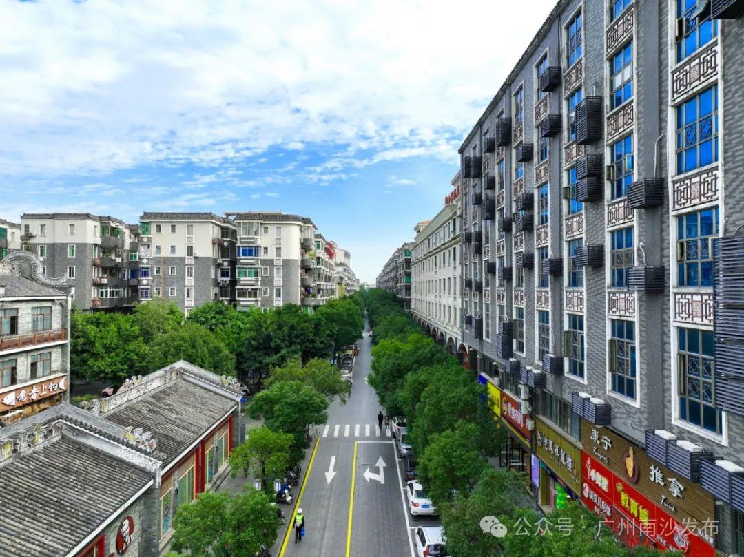 东兴二路商业功能丰富,主街人行道、行道树、路灯、景观设施齐备,沿线道路干净整洁、两侧绿化景观葱郁,两侧建筑完成了外立面提升,街区建筑色彩和风格整齐统一,链接形成一条岭南水乡特色风貌主街。