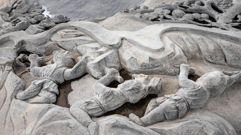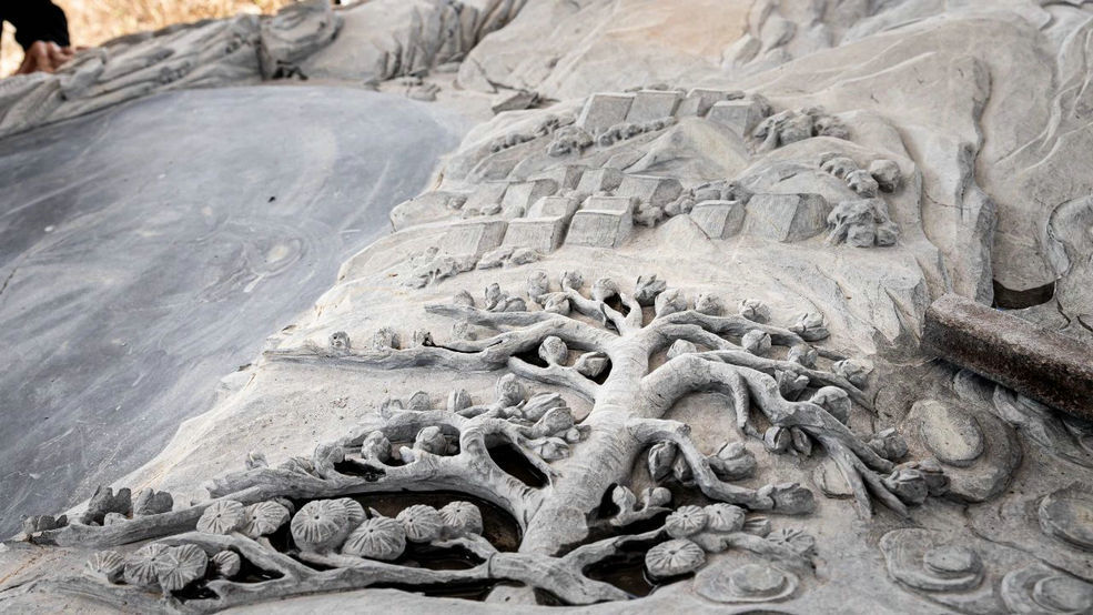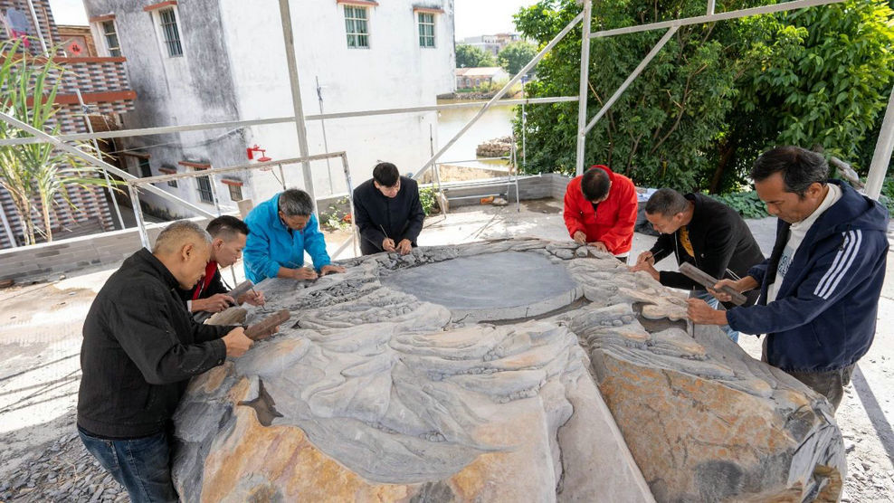 经过水口社区内数十位端砚手工艺人联手雕刻制作,目前“东坡砚源”已初见雏形。记者看到,砚石上雕刻了古时候砚工取石、凿石、搬石等生动场景,也刻画了东坡赏砚和村落美景等。砚石制作以羚羊峡为背景,将西江制成墨池,一艘艘小船“驶入西江”,画面栩栩如生。