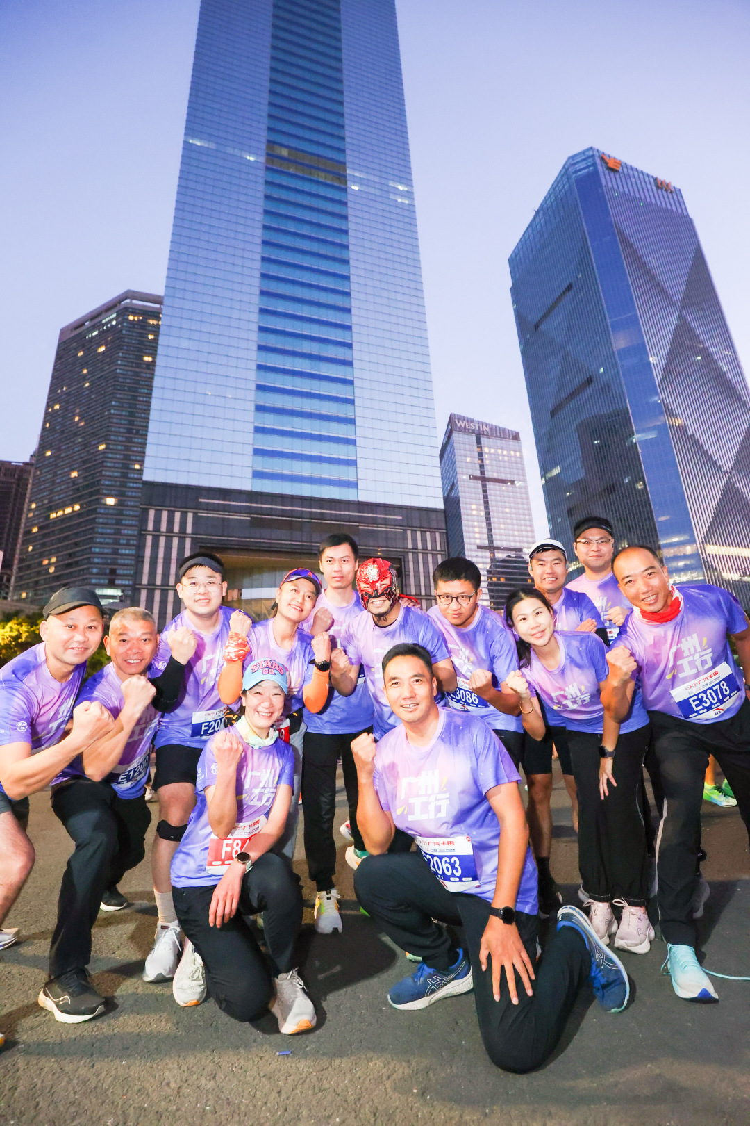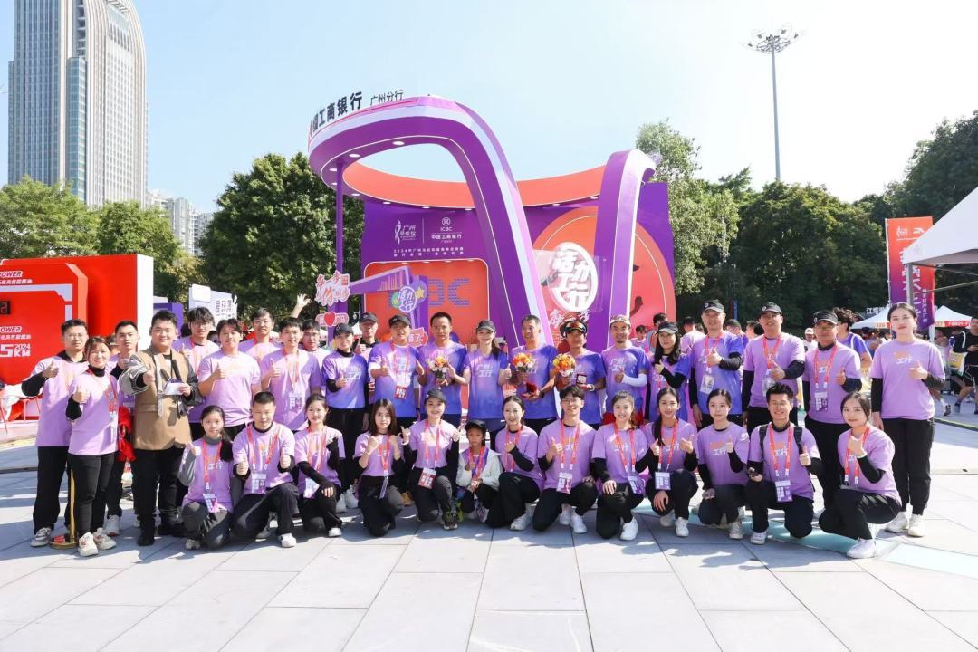 “广州工行乐跑团”活力出征,身着“广州工行”紫色跑服,成为赛道上一道亮丽的风景线。