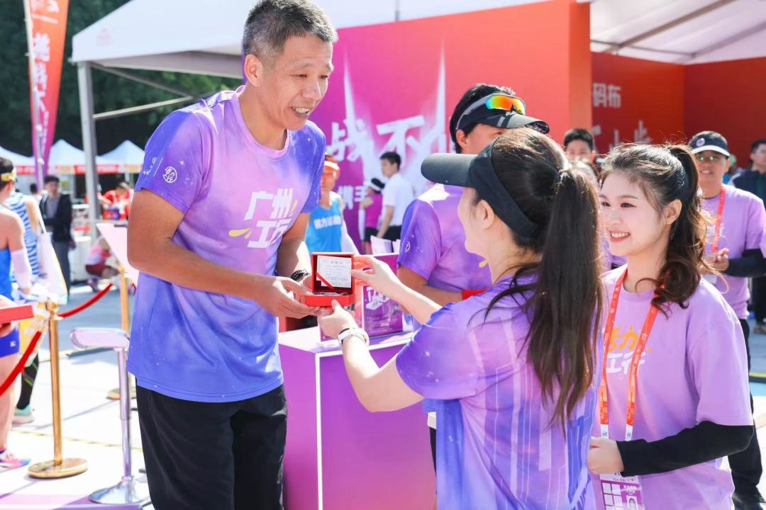 广州工行为“广州工行乐跑团”冠军颁发广马贵金属纪念品。