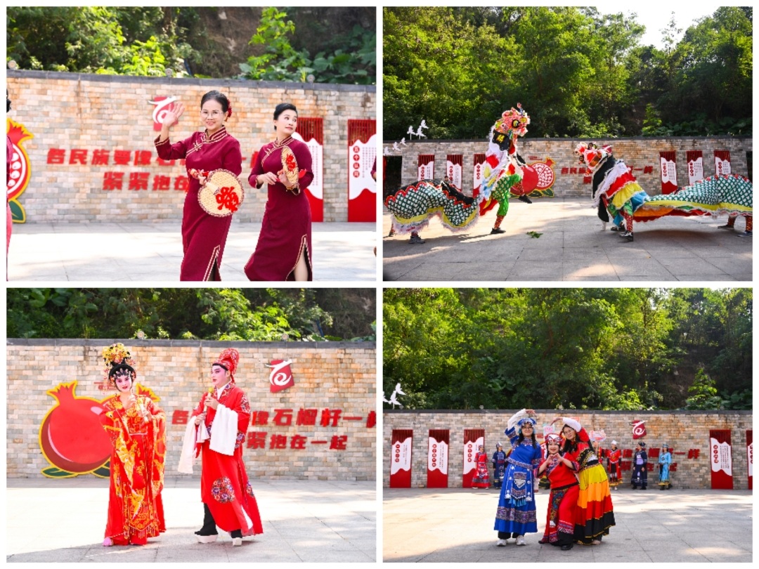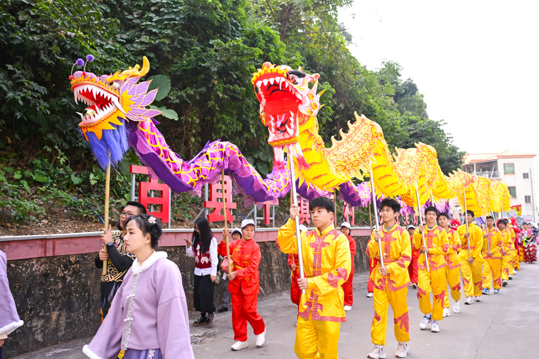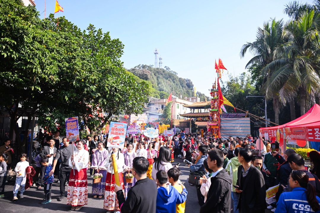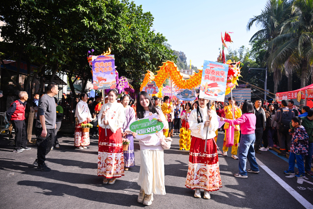 现场巡游队伍长达数百米,由近百名演职人员、非遗代表、普通群众组成的南沙区非物质文化遗产巡游方阵精彩上场,有中华文化传统的舞龙舞狮表演,有省级非遗代表项目粤剧,有市、区级非遗代表项目麒麟舞、香云纱,特别是具有疍家居民特色的抢花炮等。参加活动的除了龙穴岛当地居民,还有中山、东莞、珠海、深圳、港澳地区群众和民俗文化专家学者。