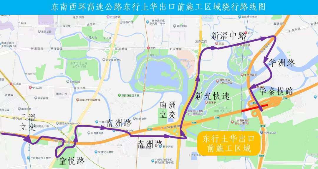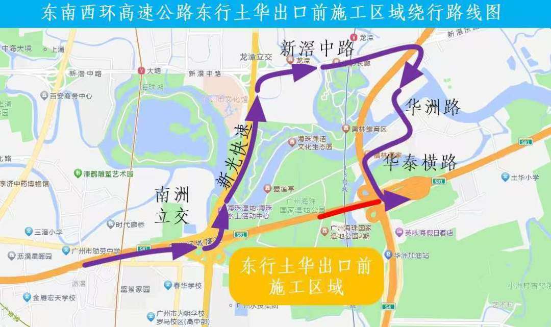 绕行路线①:原东南西环高速公路东行的车流,提前从南洲立交出→新光快速→新滘中路→华洲路→华泰横路→进入东南西环高速公路继续东行或者进入华南快速