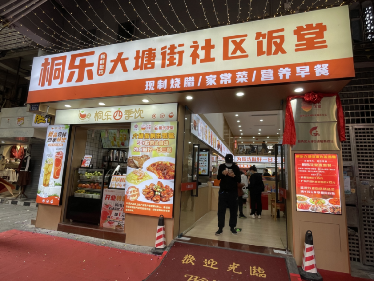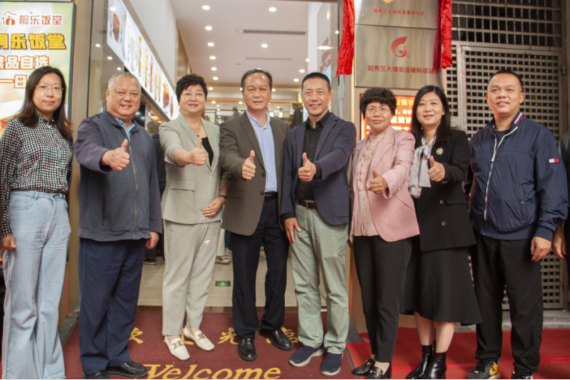 12月6日上午,位于越秀区大塘街道德政中路323号聚集了很多食客,随着礼炮声响,参与活动的领导嘉宾共同拉下了覆盖在门店招牌上的红绸。桐乐大塘街社区饭堂在掌声中,完成了简单而热闹的开业仪式,正式宣布开始运营。
