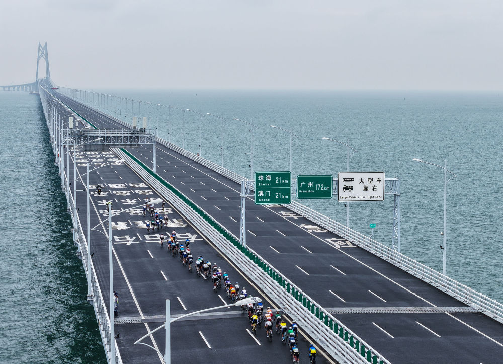 ↑2024年11月24日,2024粤港澳公路自行车赛暨第十五届全国运动会公路自行车测试赛举行,比赛跨越粤港澳三地,参赛选手途经港珠澳大桥(无人机照片)。新华社记者 刘大伟 摄