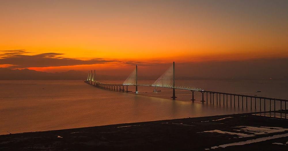↑晨曦中的港珠澳大桥(2023年12月15日摄,无人机照片)。港珠澳大桥横跨珠江口伶仃洋海域,全长约55公里,集桥、岛、隧于一体,是世界最长的跨海大桥。新华社记者 刘大伟 摄