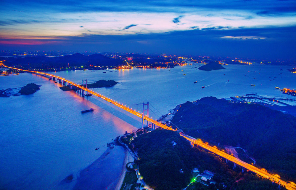 ↑虎门大桥夜景(2015年6月3日摄,无人机照片)。虎门大桥横跨珠江口狮子洋水道,连接广州市南沙区与东莞市虎门镇。新华社发