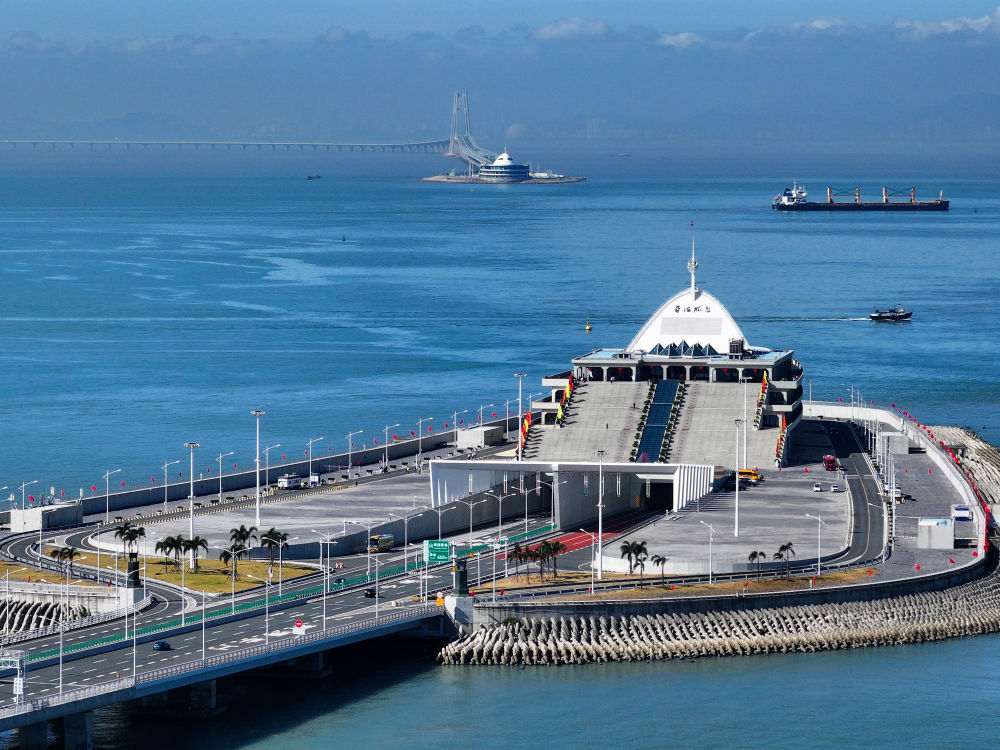 ↑2024年2月12日,港珠澳大桥珠海公路口岸出入境客流总量超13万人次,创开通以来新高。这是当日拍摄的港珠澳大桥桥头(无人机照片)。新华社发
