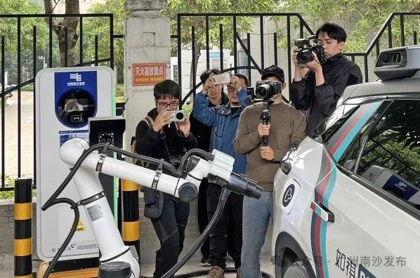 “自动驾驶电车来到充电站,车位锁自动落下,机械臂自动识别,提起充电枪,准确插入充电口,整个流程在80秒内完成。后台发送‘车辆已就位’的指令至‘顺易充’平台开始充电,充电完成后能自动结算,这一过程实现了全程无人化。”