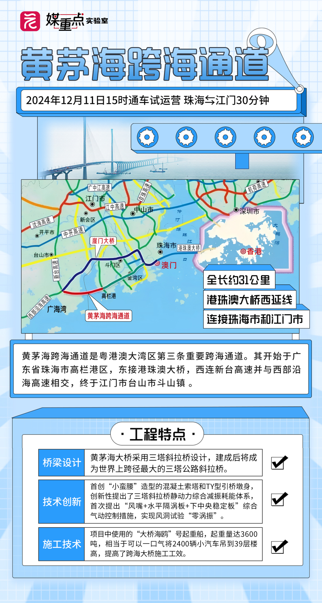 总台记者从广东交通部门独家了解到,粤港澳大湾区重大工程之一——黄茅海跨海通道项目,将于12月11日15时起正式通车运行。广东珠海至广东江门30分钟左右可达,大湾区立体交通网络进一步织密。