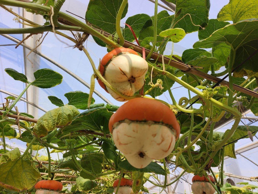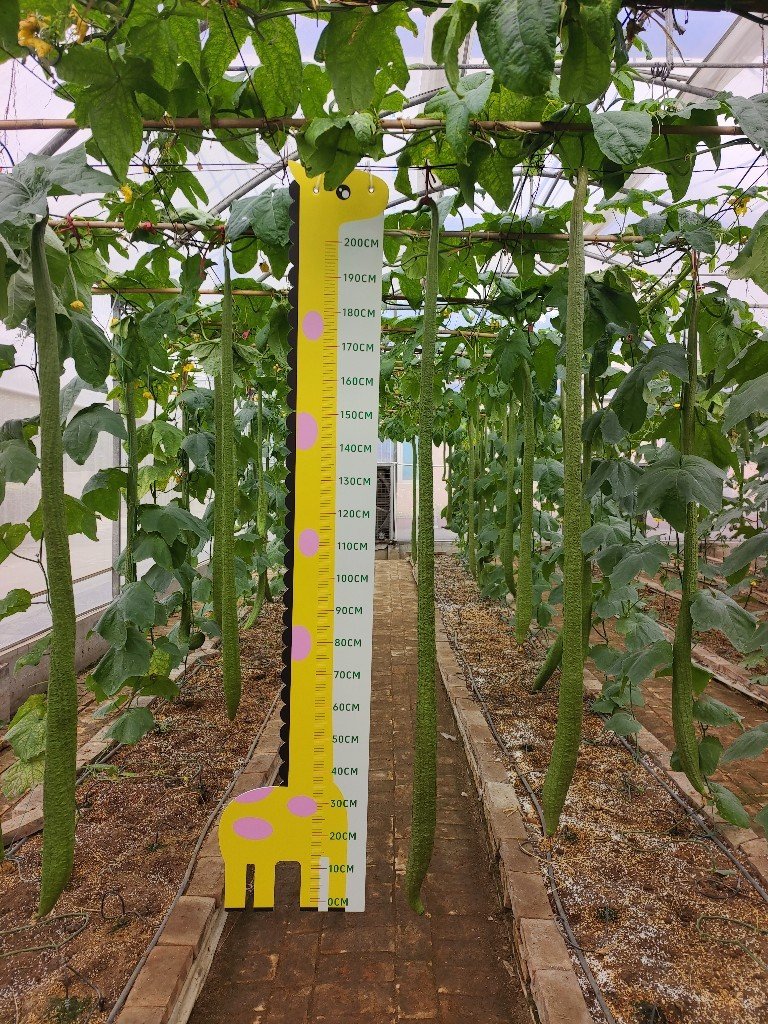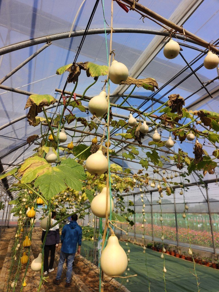 大棚瓜类展示区面积约4亩,种植瓜类品种37个,全部采用无土栽培水肥一体化栽培技术。甜瓜、苦瓜、丝瓜、南瓜等各式瓜类品种琳琅满目,瓜类不仅采摘时间较长,而且颜色丰富、种类多样、造型独特,非常适合东莞农业休闲观光采摘的推广应用。这里还配套展示了“茄子树”、盆栽蔬果等,具有很高的观赏性和趣味性,吸引了众多市民拍照打卡。