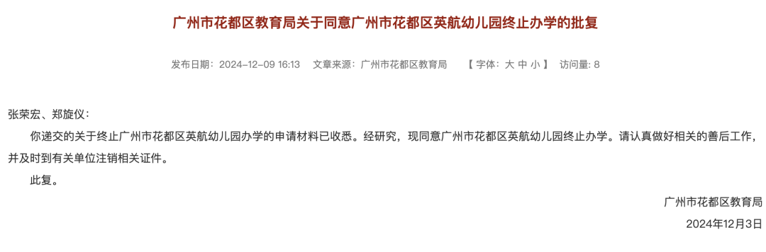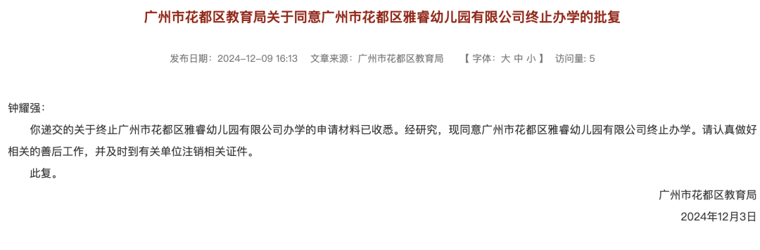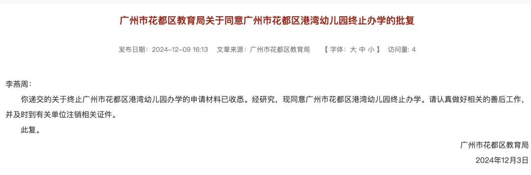 此外,花都区教育局发布4所幼儿园终止办学的批复。