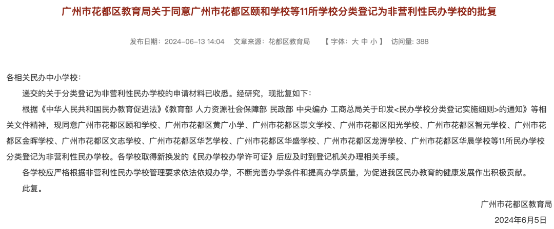 今年6月,花都区教育局曾发布关于同意广州市花都区颐和学校等11所学校分类登记为非营利性民办学校的批复。