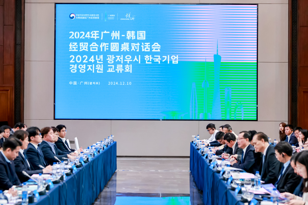 12月10日上午,2024年广州-韩国经贸合作圆桌对话活动在广州海心沙英迪格酒店举行。活动吸引了现代汽车氢燃料电池系统(广州)有限公司、科丝美诗、韩国产业银行等韩国在穗投资企业等50位高层代表参与。