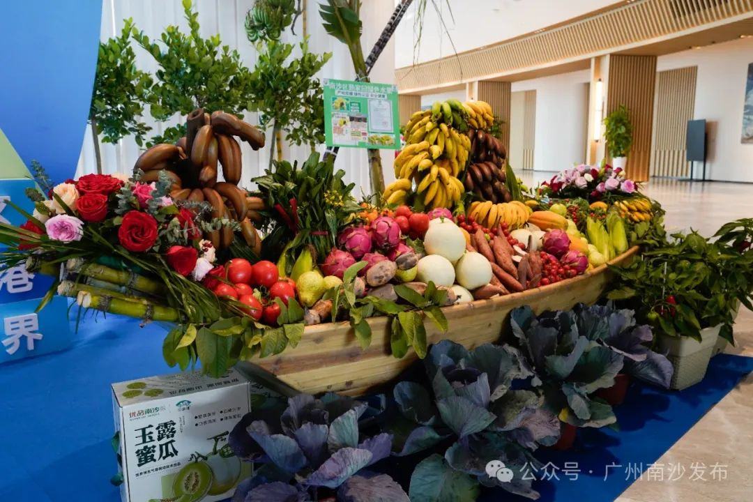 现场,两米长的超大水果船成为一大吸睛点。玉露蜜瓜、红肉番石榴、火龙蕉、香妃小番茄等各式水果“乘船出海”。南沙青蟹、新垦莲藕、香云纱等一批南沙“土特产”也集中亮相。