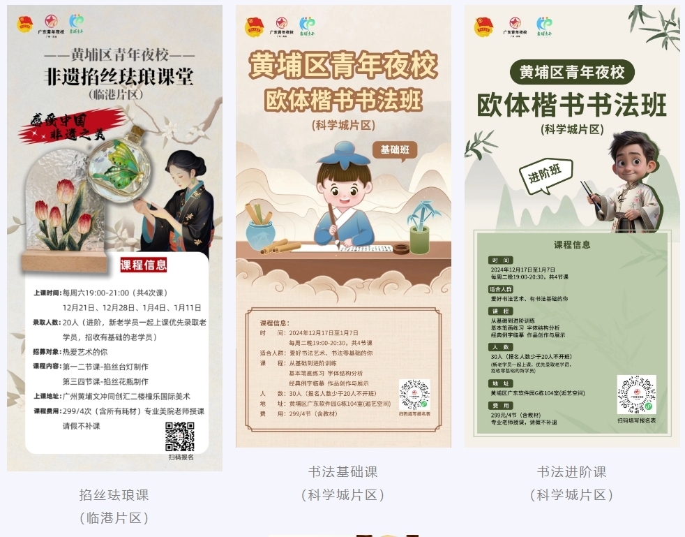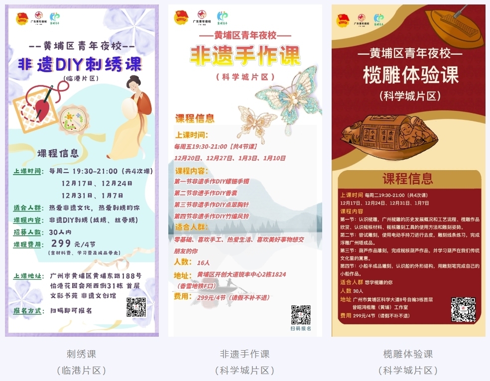 广州市黄埔区青年夜校第三期合伙人课程来了,本期在上期课程基础上“上新”榄雕、刺绣、竹笛、咖啡等多门有趣的课程。