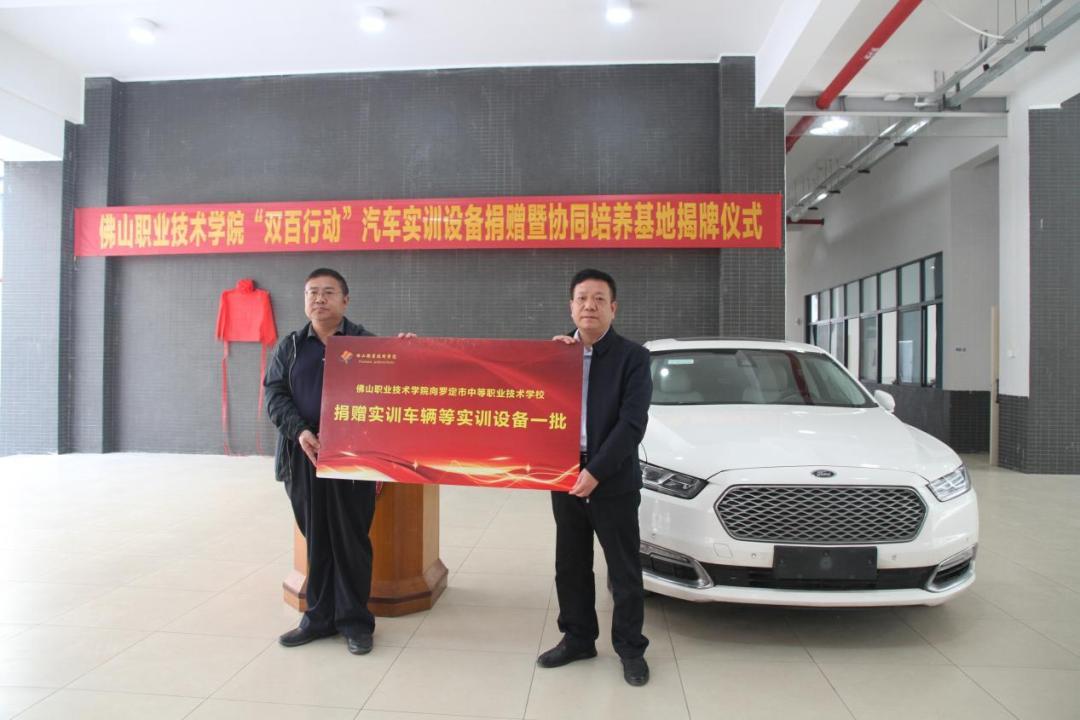 调研当天,佛职院向罗定市中等职业技术学校捐赠实训车辆等一批实训设备,并为“汽车专业中高职贯通协同培养基地”揭牌,为该校在新能源汽车专业建设、人才培养、课程建设等方面提供支撑。