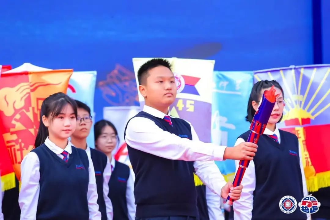 ●作为一所百年名校,培正中学有着独特的级社制度。在庆典的高潮部分,105位旗手携带飘扬的社旗入场,每一面社旗代表一个级社,展示了培正中学独特的“级社”文化。随后举行的薪火相传仪式,火炬从年龄最大的级社代表手中依次传递到年龄最小的代表手上,象征着红蓝薪火代代相传,经培正人代代传承,开枝散叶,发扬光大。