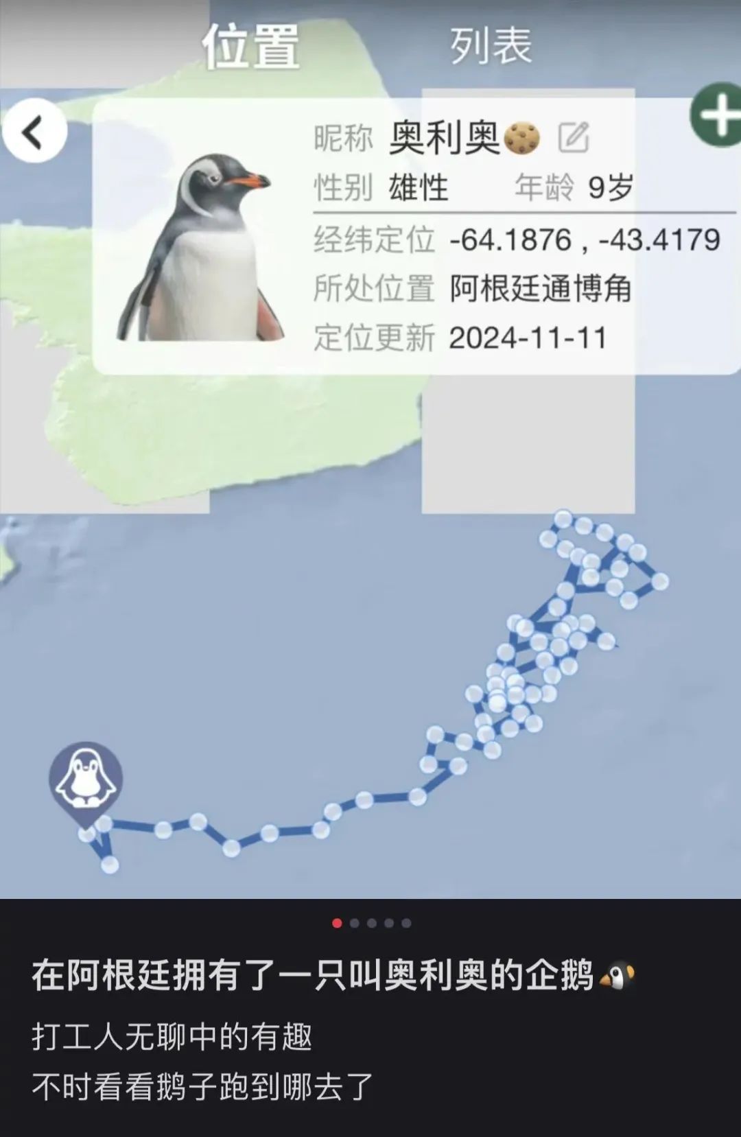 有博主说自己领养了一只叫“巧巧”的企鹅,平时上班的乐趣就是看它散步。可有一天看它沿着海岸一路漂流,义无反顾,两个月不上岸,一口气跨越了阿根廷通博角。